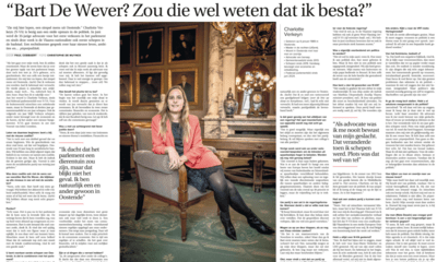 (aarzelend) “Ik wil daar wel iets op zeggen, maar ik hoop dat je daar niet te veel op focust. (wikt haar woorden) Als advocate was ik me nooit bewust van mijn geslacht. Man of vrouw: je verdedigt je cliënten en dat is het. Dat veranderde toen ik zes jaar geleden schepen werd. Plots was mijn geslacht van tel. Ik vond dat heel frappant. Sommige mannen zien mij niet als gelijkwaardig omdat ik een vrouw ben. Ik heb daar zelfs een naam voor: pispotpolitiek. Dan gaan ze dingen bedisselen aan het urinoir omdat de vrouwen het niet zouden horen. Dat gebeurt hier echt, hé. Dat kan me kwaad maken. Maar ik wil dat niet opblazen. Voor de enkelingen die zo in elkaar zitten, bestaan er duizenden andere mannen. Vandaar dat ik zeg: als het gaat over vrouwenrechten, zijn er belangrijker kwesties dan seksisme in de politiek.”